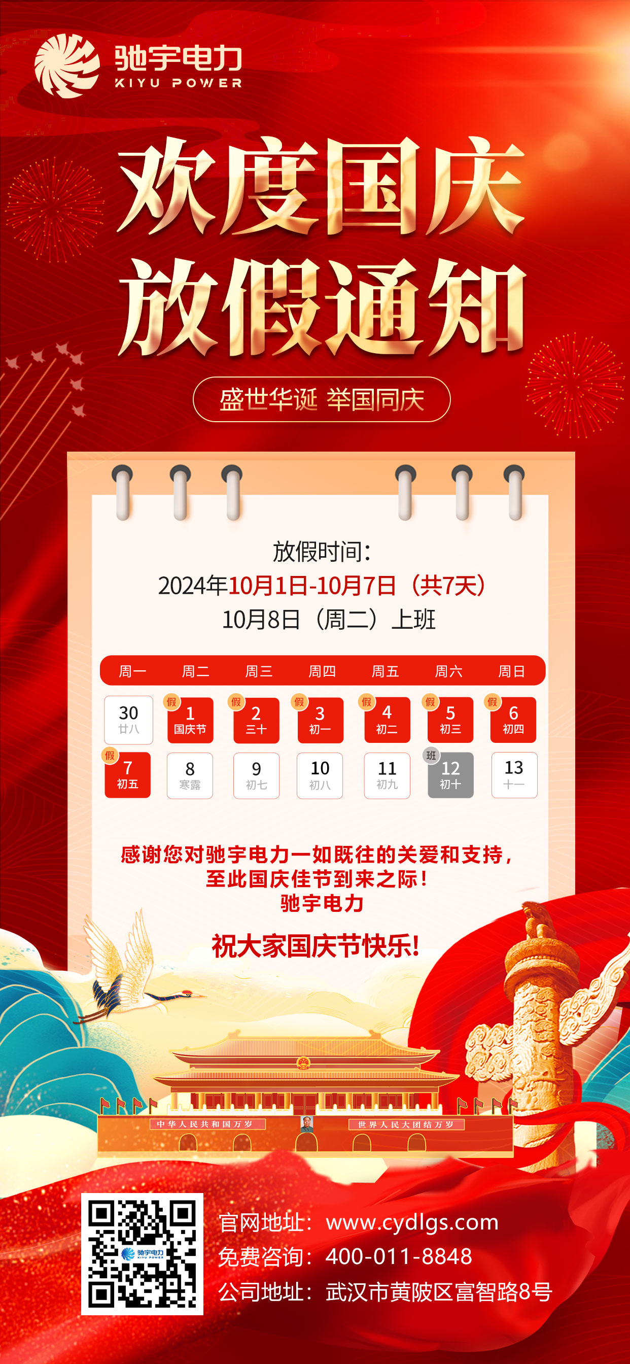 根據(jù)《國務院辦公廳關(guān)于2024年部分節(jié)假日安排的通知》,結(jié)合我公司實際情況,現(xiàn)將國慶節(jié)放假安排的有關(guān)事宜通知如下: